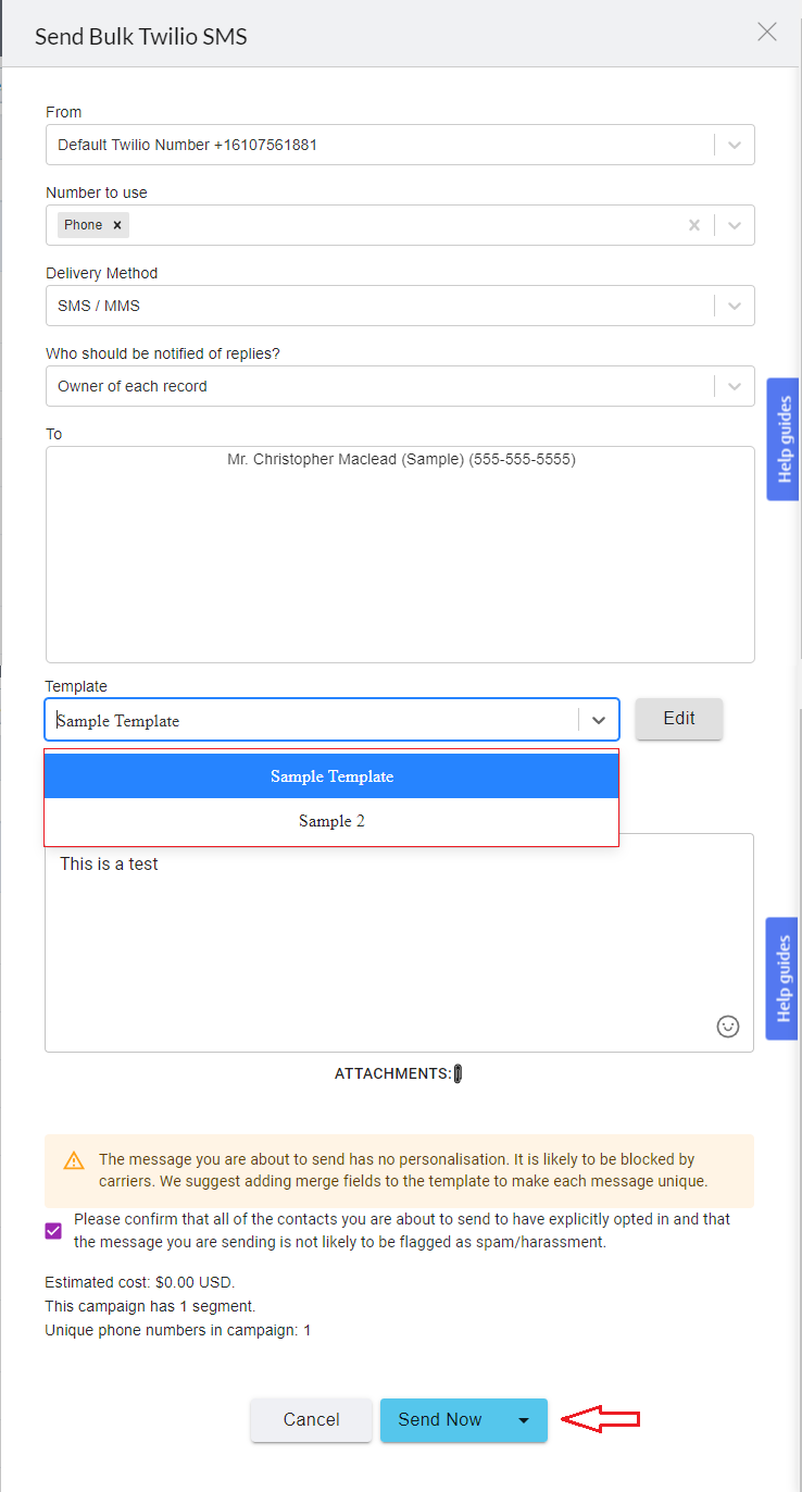 2.Click Send Bulk Twilio SMS