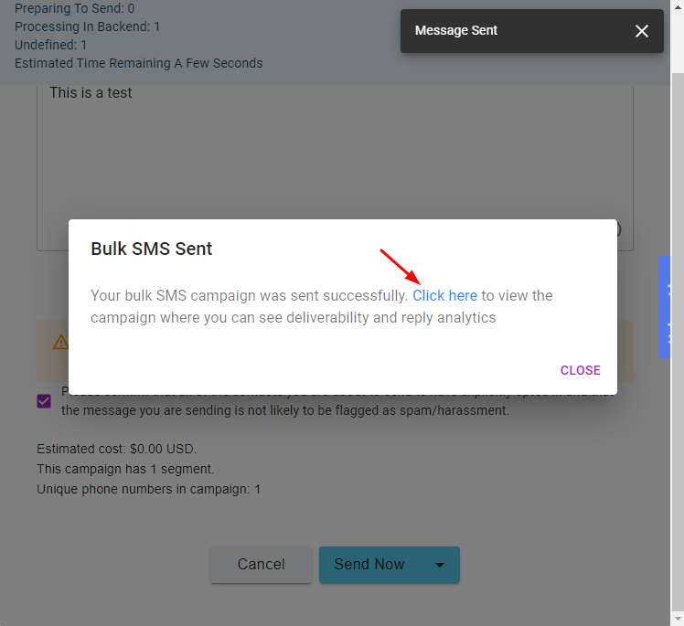 4. To view the campaign stats, click on the Click here link inthe popup notification,