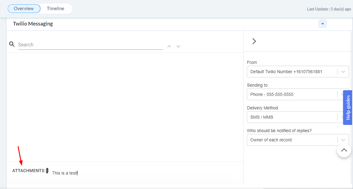 Sending to: e.g: Phone - 555-555-5555 ( you can choose from phone or mobile or any different phone number fields on the records)
