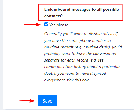 (Generally, you'll want to disable this as if you have the same phone number in multiple records (e.g. multiple deals), you'd probably want to have the conversation separate for each record (e.g. see communication history about a particular deal. If you want to have it synced everywhere, tick this box.)